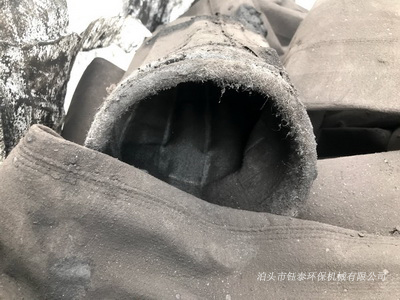 除塵器使用地點(diǎn):寧夏石嘴山,除塵濾袋使用壽命:3年,除塵濾袋規(guī)格:500g滌綸針刺氈,粉塵類型:黑砂,粉塵特性:粗粉塵、濕度大,干燥時會變成固體并粉碎,工作溫度:低于60℃除塵器吸風(fēng)口處有一個除塵濾袋在袋口損壞,濾布完全成了黑色,由于缺少一個濾袋