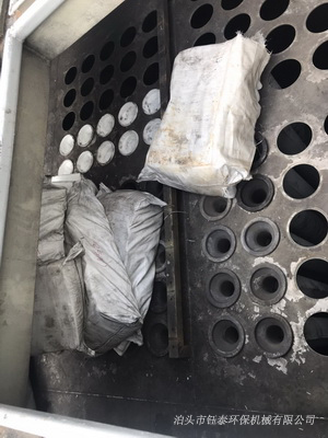 除塵器吸風(fēng)口處有一個除塵濾袋在袋口損壞,濾布完全成了黑色,由于缺少一個濾袋,造成除塵器出風(fēng)口周圍的花板上有一堆灰塵。