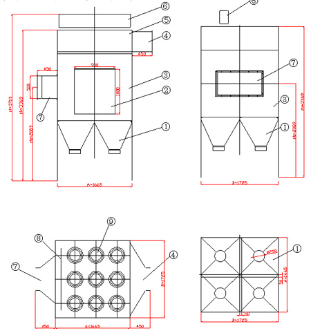 3、設(shè)備外形尺寸見附圖及尺寸表。我公司還可根據(jù)用戶現(xiàn)場場地情況設(shè)計(jì)符合用戶要求外形的除塵器。