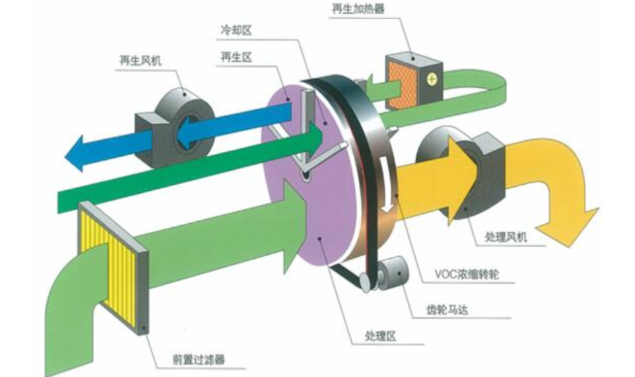 通過轉(zhuǎn)輪的旋轉(zhuǎn),可在轉(zhuǎn)輪上同時完成氣體的濃縮和沸石的再生。進入濃縮轉(zhuǎn)輪的有機廢氣在常溫下被轉(zhuǎn)輪吸附區(qū)吸附凈化后直接排放至大氣,接著因轉(zhuǎn)輪的轉(zhuǎn)動而進入脫附區(qū),吸附了有機物質(zhì)的沸石在此區(qū)內(nèi)脫附,吸附在沸石上的有機物被分離、脫附、進入后續(xù)處理系統(tǒng),如此循環(huán)工作。