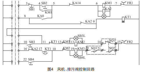 風(fēng)機(jī)、排污閥控制回路如圖4所示,圖中3~22為接線端子編號(hào),KA14為基本水位繼電器常閉節(jié)點(diǎn),除塵器長時(shí)間處于停運(yùn)狀態(tài)并且排污閥存在漏水現(xiàn)象,水箱內(nèi)部大部分水流失。遠(yuǎn)程啟動(dòng)風(fēng)機(jī)時(shí),負(fù)壓對(duì)水箱水位造成波動(dòng),使基本水位信號(hào)消失,KA14斷開,風(fēng)機(jī)停運(yùn)聯(lián)鎖排污閥打開,同時(shí)進(jìn)水電磁閥動(dòng)作,KT1計(jì)時(shí)時(shí)間到后排污閥關(guān)閉。關(guān)閉到位,進(jìn)水電磁閥保持進(jìn)水,基本水位信號(hào)亮起,KA14閉合,風(fēng)機(jī)啟動(dòng),造成基本水位信號(hào)消失。之后不斷循環(huán)以上步驟,浪費(fèi)大量水源及影響設(shè)備正常運(yùn)行,需要及時(shí)對(duì)排污閥漏水問題進(jìn)行處理。