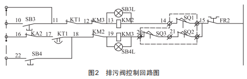 (2)回路元器件損壞。如圖2所示,按下sB4按鈕,限位正常,關(guān)排污閥無反應(yīng),需要查看熱偶FR2是否動(dòng)作,或查看接觸器KM3是否缺相及節(jié)點(diǎn)損壞。熱偶動(dòng)作需要復(fù)位,并檢查閥桿是否卡澀及超過行程,結(jié)合實(shí)際問題進(jìn)行處理。