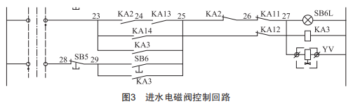 進(jìn)水電磁閥控制回路如圖3所示,圖中23~29為接線端子編號(hào),除塵器上水流程是電磁閥YV打開,水位到達(dá)備用水位時(shí),觸發(fā)KA11動(dòng)作,KA11的常閉節(jié)點(diǎn)斷開,電磁閥失電,停止注水。導(dǎo)致水箱漫水的原因主要有以下幾種: